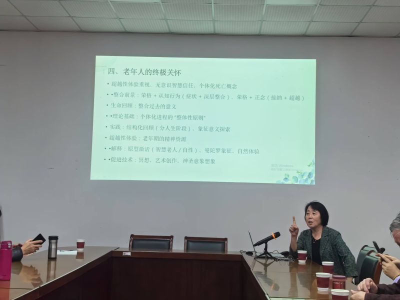 讲座中,鲍谧清教授以荣格的成人发展与老化心理学为切入点,提出“人生两阶段论”——前半生追求外在成就,后半生应聚焦内在成长。她凭借深厚的专业功底与丰富的实践经验,将理论知识以通俗易懂的方式娓娓道来,强调老年期是“智慧与成长的潜力期”,并指出“终极关怀”的核心在于接纳生命完整、活出真实自我。她建议老同志撰写“自我小传”记录人生故事。